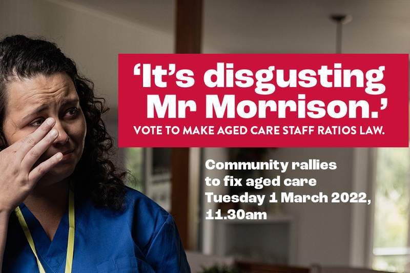 Join us as we rally with ANMF comrades to make aged care staff ratios law. With aged care in crisis, we're calling on the Morrison government to improve staffing levels on the one-year anniversary since the release of the aged care royal commission report.