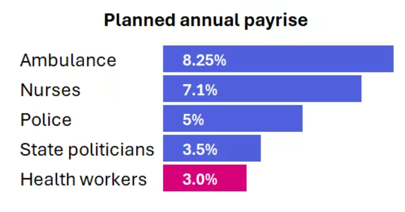 The Victorian Government’s pay offer is the worst to any public sector workforce. In 2025 other essential services secured much needed pay increases — police (5%), nurses (7.1%), and paramedics (8.25%). According to the union, health workers are asking for 6%.